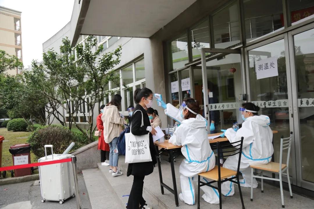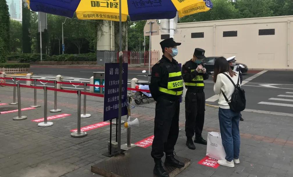 打造师生安全的可靠屏障。在延安西路、中山西路、广富林路和文汇路校门口,返校同学间隔1.5米有序排队等候验证、测温,工作人员逐一查验校园卡、随申码、返校承诺书等,合格后方可进入校园。特别提示大家,在疫情结束以前,学校实行封闭式管理,如需离校,请向学校申报,批准后方可离校。