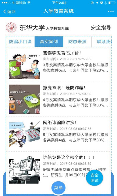 新生入学教育是新生步入大学的第一课。针对“95后”大学生的网络生活特点,学校充分利用易班平台,开发“新生入学教育”易班应用,集学校介绍、事项查询、政策制度解读、安全教育宣传、互动交流、心理普测等功能于一体,将新生入学教育管理和服务工作前置,同时也搭建起了新生与学校、老师和同学们线上沟通的平台,吸引了一大批新生注册使用。截止目前,系统功能使用51290次,独立访客人数近3000人。